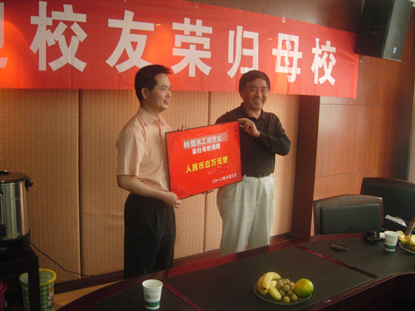 班长罗奕宏、团支书刘银珍分别发言用“感谢、感动、感恩”六个字表达了全班同学对母校、母系和恩师的拳拳真情。同时介绍了本次同学聚会“同学情真,回忆永恒”的主题和制作通讯录、纪念相册及建立QQ网络交流平台事宜。会议最后,罗奕宏代表88级木工全体校友向母校捐赠人民币10000元,祝愿母校越办越好,越走越强。
