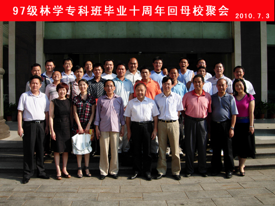 2010年7月3日,我校97级林学专科班二十多位同学从全国各地相约重聚母校长沙校区。座谈会在学校行政楼四楼会议室举行,学校党委副书记曾思齐教授、校友会办公室主任王世忠、副主任王建峡、林学院党总支书记陈建华、院长文仕知、副书记颜正良及部分任课老师参加了此次座谈会。会议由校友会办公室主任王世忠主持。校友们分别向母校老师介绍了从学校毕业后的工作情况。