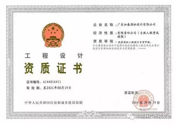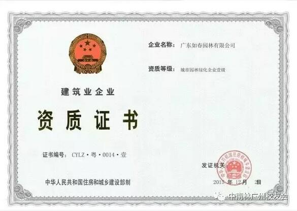 如春园林拥有《城市园林绿化企业》壹级资质,《风景园林工程设计》甲级资质,《林业调查规划设计》乙级资质,《造林工程规划设计》乙级资质,《造林工程施工》乙级资质,《旅游规划设计》丙级资质。在业内率先通过国际质量管理体系、环境管理体系、职业健康管理体系等安全体系认证,作为AAAAA级信用企业,连续10年被评为广东省守合同重信用企业。