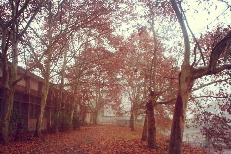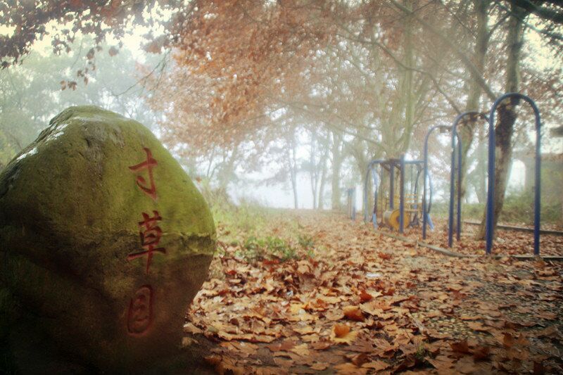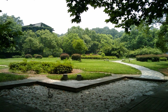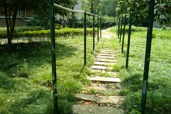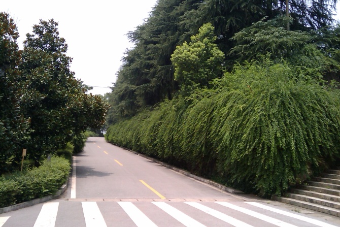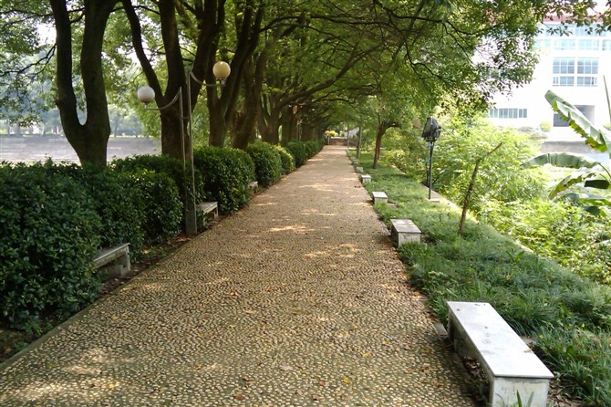 虽然已经长出了些许荒草,却挡不住那些高大梧桐,笔挺雪松,青翠樟木构造的美。漫步在梧桐叶铺满的金黄色的干道之上,如蜻蜓点水般,踮起脚尖,撑起一把小雨伞,殷然回眸一笑,真是美到极致。走在鹅卵石铺垫的石子小路上,抚摸周围草木的枝条,虽咯着脚丫子,却分外舒服。